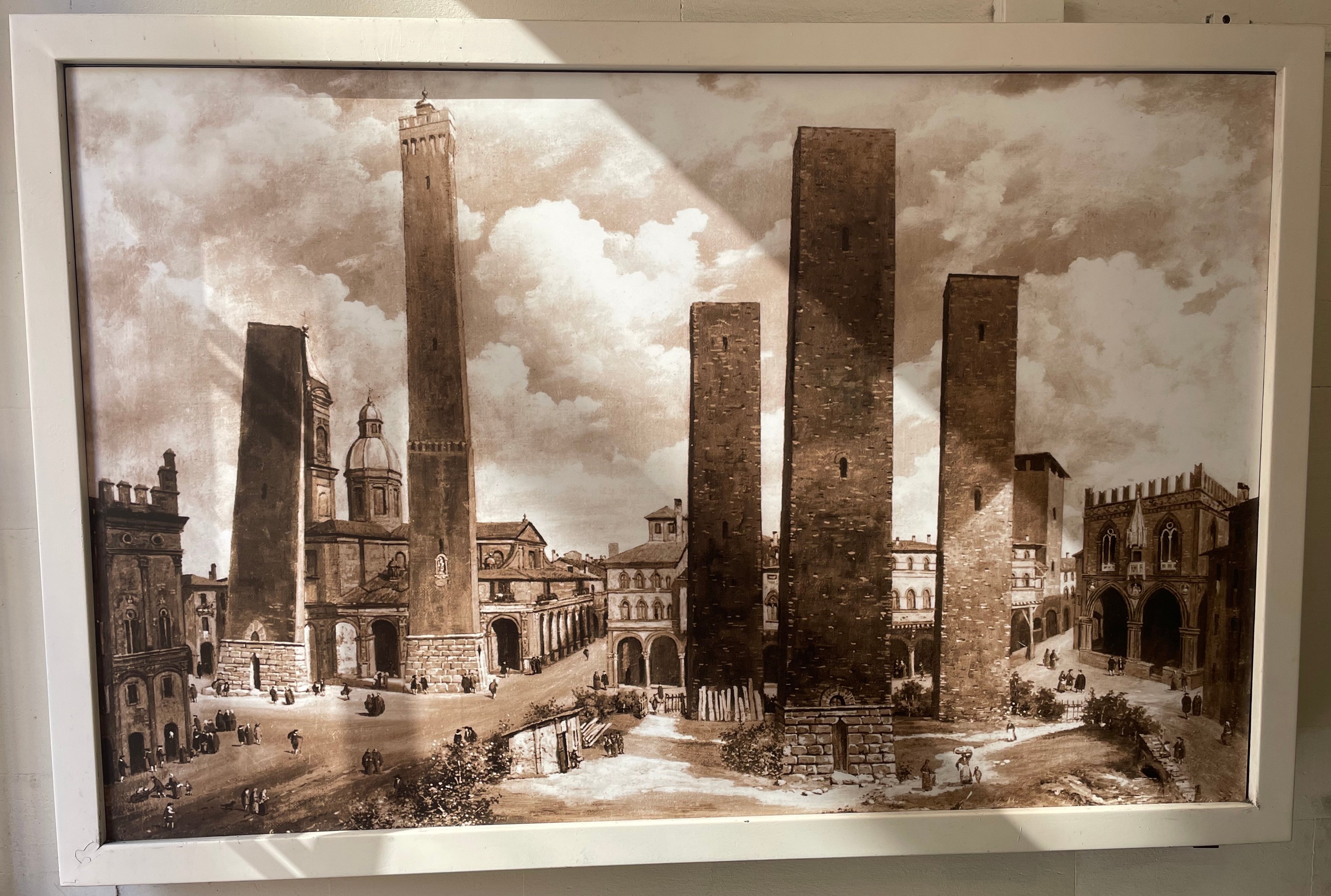 Neben der vielen Arkadengänge beeindrucken Bolognas Türme. Am Rande des ehemaligen jüdischen Ghettos (Ghetto ebraico) von Bologna stehen "Le Due Torri", die zwei Türme "Garisenda e degli Asinelli". Die Türme wurden im tiefsten Mittelalter (um 1100) im Wettstreit zweier reicher Familien errichtet. Als sich der Torre della Garisenda bedenklich zu neigen begann, musste der Bau gestoppt werden. Später wurde der Turm sogar noch in der Höhe gestutzt. Angeblich ist der Turm noch schiefer als der schiefe Turm von Pisa.